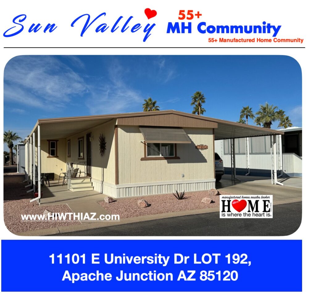 SOLD: 11101 E University Dr LOT 192 Apache Junction AZ 85120 Sun Valley MH Community March 19, 2024January 19, 2026FWS SOLD ON 3/19/2024 for $64,000 Your SOLD Home Should Be Listed On This Page…Call Me When You Are Serious About Selling Your Home