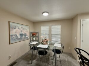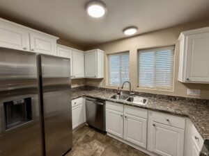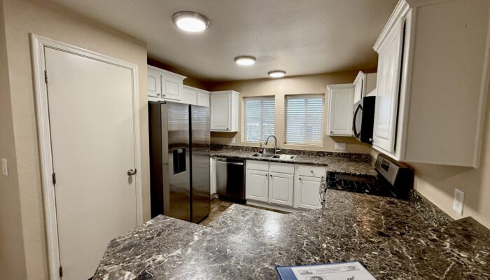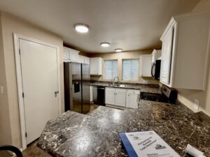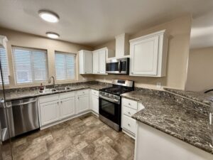 Kitchen features Newly Painted Upper & Lower Storage Cabinets, New Full Wall Titled Backsplash, Laminate Counter Tops, Refrigerator & Gas Range, Pantry. Kitchen Dining Included Leafed Table With 2 Chairs.