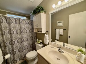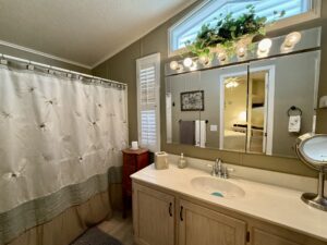 Main Bath Features Step-In Garden Tub Shower,  Large Vanity With Storage & Linen Closet.