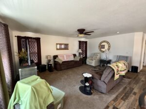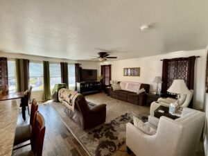 Living Room Has Sofa, Recliner Sofa, Recliner, Comfort Chair, Occasional Tables, TV on Console Sideboard.