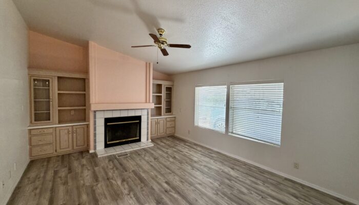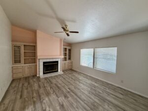 Spacious Den With Fireplace & Built-In Storage Shelves & Cabinets.